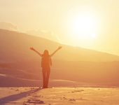 Happy joyful woman having fun outdoors in winter, standing on th