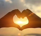 Heart shape making of hands against bright sea sunset and sunny